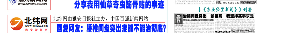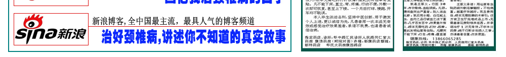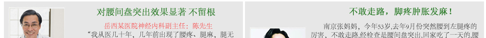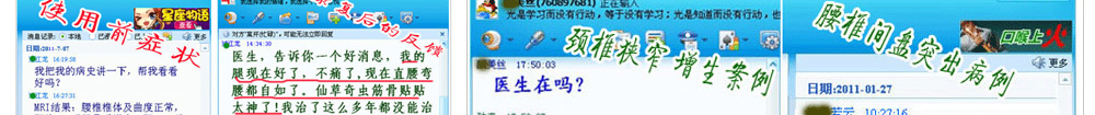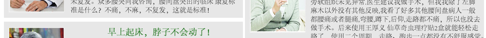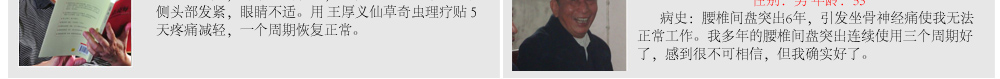 ③我不以暂时有效蒙蔽,我相信中医任何之法都能改善局部疼痛和症,而本人更以轻松弯腰拾物、自由活动来检验效果。 王厚义秉承中医创新,打破传统活血化瘀局限,把腰椎间盘突出物(髓核)当作骨血栓,反常规用破血溶栓之法,发明 仙草奇虫筋骨贴,原料奇,效力猛,通过经皮渗透吸收,强劲效力可穿透脊椎屏障及深层组织,直达病灶,很快就将压迫神经引起疼痛的突出物(髓核)和增生物软化、溶解,使腰(颈)间盘恢复正常。王厚义,擅治血栓、骨病顽疾。有人说他是 民间中医奇人,有人说他是 民间西医高手,他却自认为是新中医,即能遵照传统又能结合现代医学。王厚义认为,天下万物,远至飞禽走兽,近到虫虫草草都能创造无穷变化和神奇。因此他擅用血肉有情之品组方入药,常能出奇制胜,效果异乎寻常。王厚义竭尽毕生精力、财力,研制出民间奇方“仙草奇虫筋骨贴”,屡创中医奇迹。 在安徽大别山地区,很多人都知道中医民间奇人王厚义发明的专治腰间盘突出、颈椎病奇方。凡腰椎间盘突出不能下床、行走,疼痛、僵直甚至瘫卧在床,医生已建议其手术者,当天抬进来,用王厚义仙草奇虫大药袋敷一次,晚上就能自己走出去,第二天就能上下楼,敷几次就能跑能跳,腰部从内到外透着从未有过的舒服,最快的十天能爬山、打球、跑步样样自由,连许多专业医学研究机构都连连称奇。 得病本已痛苦,而滥用医术更泯灭道德 患者朋友,我叫王厚义,一生淡泊名利,从不做欺诈虚伪之事,平生专攻血栓,骨病顽疾,坚持中医创新,集毕生精力,财力发明仙草奇虫筋骨贴用于颈椎病,腰间盘突出、肩周炎.患者反映强烈,目前在全国许多城市受欢迎,并受到国家体委及康复医学会机构的高度重视,该疗法被收录我国民间特色疗法之一。 治腰间盘突出,颈椎病 、肩周炎本人从1983年开始研究,至今25年,多从治疗血栓疾病受到启发,把颈、腰间盘突出物当作骨血栓,别人用活血化淤,我独创破血清淤中医反治,几乎百发百中,很多患者一夜不麻、不肿、不痛,能翻身下床,贴不到两盒,就能基本行走甚至下床,从1983年接诊以来,最重要的是很多患者平均用到1-2个周期左右定会康复,打球、爬山、开车、跑步与正常人一样自由,很多严重患者来诊,早上搀扶进来,晚上自己走出去,更有已偏瘫病人,敷一贴恢复知觉,眼见祖国中医博大精深之处,我同患者一样倍感欣慰和惊喜。000 医道存优劣 实践出真知 有人说我是西医又有人说我是中医,我自认为本人是新中医,既能遵照古训又不拘迂泥,更能结合现代科技,中医中药的伟大之处,天下虫虫草草,飞禽走兽都可入药,而本人擅长用水蛭、土虫、蜈蚣等血肉之品入药组方,往往出人意料,但屡屡能见奇效,我从不以有效蒙骗消费者,我相信中医任何外治疗法都能改善局部疼痛,祛淤消炎,而本人治疗腰突 颈椎顽症,更以轻松弯腰拾物,自由活动,高上低下舒服轻松,重在治本来检验效果。 我这阳光花园林先生是我的朋友,“于2002年患腰4-5椎间盘突出、颈椎增生,头晕手麻,腰痛、腿麻胀无力,肌肉萎缩,走不成路,术后发生截瘫。对他这样一个长期躺卧在床的病号来说,做梦也没想到会有奇迹发生,用仙草奇虫筋骨贴当晚就有感觉,只用了二盒能走五六里路,亲朋好友无不感到惊讶而纷纷购买此药。 仙草奇虫筋骨贴的神奇功效,目前在我 这腰间盘突出、颈椎病、肩周炎人中广为流传。如今, 林先生已是我过命至交。 以上实例屡屡发生,患者请信我此言,我言句句属实,如有半点虚假愿遭天谴。 治病讲医德,做人当讲诚信 患者用仙草奇虫筋骨贴,请1贴连用1天,每晚敷用,白日摘下,一 贴比一贴效果好,更省钱,用药期间无须打针、按摩、牵引浪费金钱之举,凡颈椎病脚踩棉花,走路前跄,穿衣拿筷费劲者,头晕呕吐头痛者,及腰突不能正常行走,卧床,医生已建议手术者使用此方 ,方显物有所值,不怕你病重,越重康复效果越佳,且很多患者花万元治疗此病不如我几百元之疗效,平生不做亏心事,,一贴用一次, 一贴比一贴好,如与其它治疗方法效果相同或无奇效发生,绝不收半点药费。同时盼患者勿起贪念,天理难容。